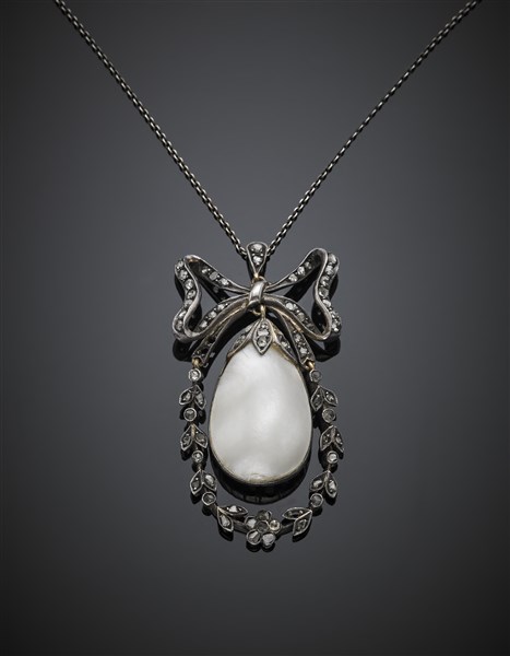Silver and 9K gold mother-of-pearl and rose cut diamond bow and garland pendant with a cm 39 circa silver chain, in all g 12.60 circa, length cm 39 circa. (losses)