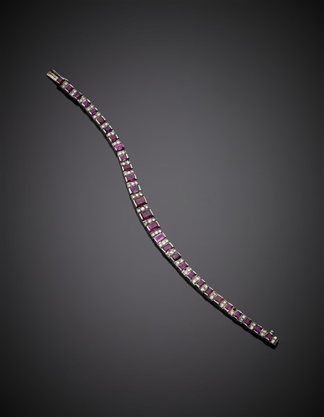 Bracciale in oro bianco rubini rettangolari a scalare e diamanti rotondi, g 10,10 circa, lungh. cm 15,50 circa. (mancanze)