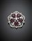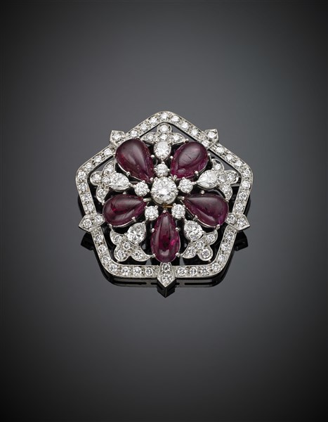 Spilla in oro bianco con diamanti rotondi e a goccia per complessivi ct. 4 circa e rubini a goccia cabochon per complessivi ct. 7 circa, g 13,20 circa, lungh. cm 3,80 circa. In scatola Chiaravalli