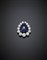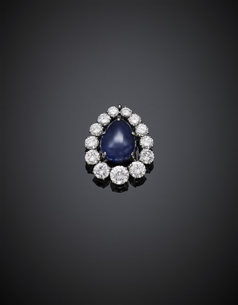 Cabochon pear shape ct. 5.50 circa sapphire and diamond white gold pendant, diamonds in all ct. 3.50 circa, g 6.30 circa, length cm 2.50 circa.