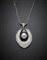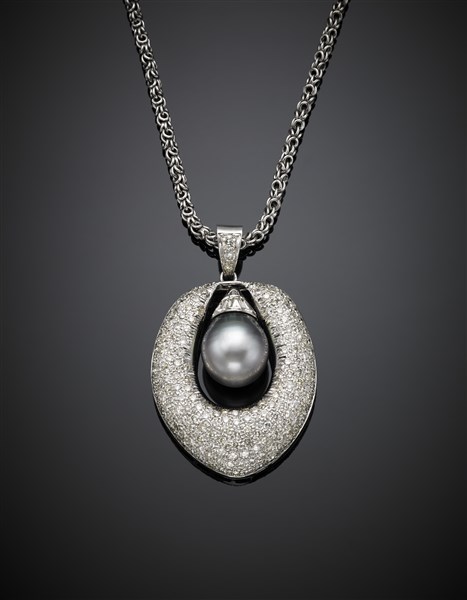 Collier in maglia a fune con pendente di cm 5,30 circa in oro bianco e diamanti per complessivi ct. 4,50 circa, al centro un perla Tahiti di mm 13,10 circa, g 35,10 circa, lungh. cm 46,80 circa.