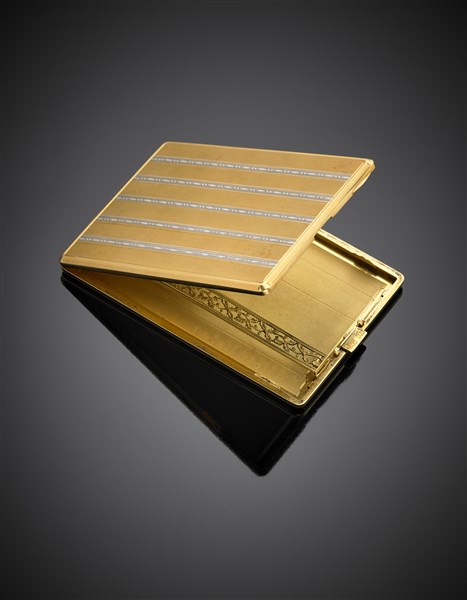 Portasigarette in oro giallo e bianco cesellato, g 179,50 circa, lungh. cm 12,20 circa.
