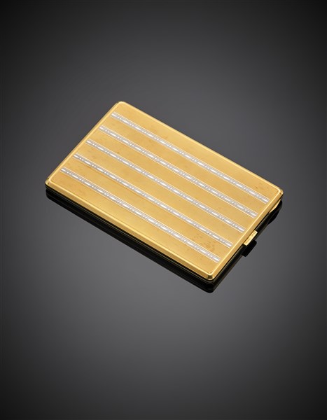 Bi-coloured chiseled gold cigarette case, g 179.50 circa, length cm 12.20 circa.