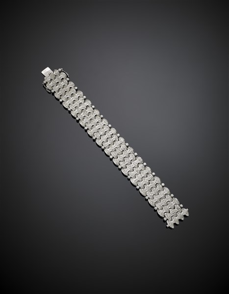 Bracciale modulare a fascia in oro bianco e diamanti per complessivi ct. 15 circa, g 64,90 circa, lungh. cm 19, h cm 2,10 circa.