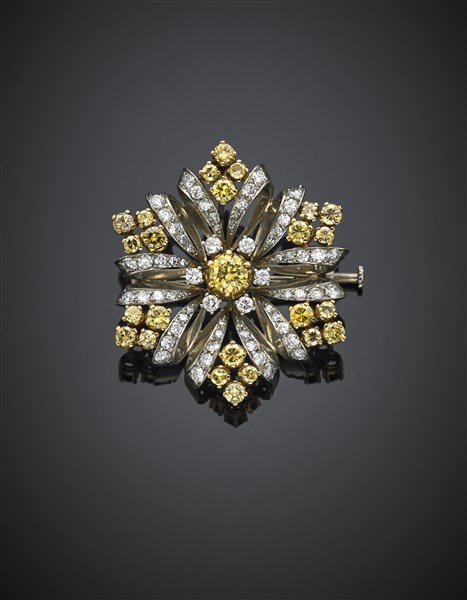 Broche a fiocco di neve in oro bianco con diamanti incolori e fancy yellow per complessivi ct. 3,80 circa, il diamante centrale di ct. 0,50 circa, g 12,50 circa, diam. cm 3,70 circa. In scatola Chiaravalli