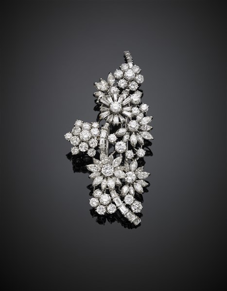 Broche floreale in platino e diamanti rotondi, navette, baguette e tapered per
