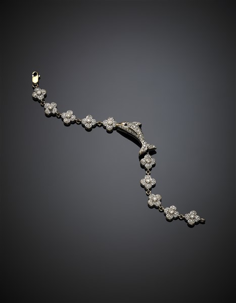 White gold diamond bracelet with a dolphin central, on the back the word "luck", blue stone for the eye, g 17.70 circa, length cm 18 circa.