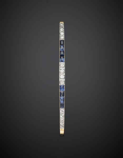 Old mine diamond and sapphire yellow gold bar brooch diamonds in all ct. 1.50 circa, g 7 circa, length cm 8.60 circa. French hallmarks.