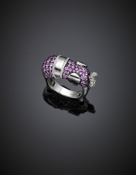 Anello in oro bianco a elefante con diamanti e corindoni sintetici, g 10,10 cir