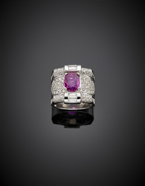 Anello in oro bianco con diamanti e al centro un rubino a cuscino di ct. 4,10 circa, diamanti per complessivi ct. 1,50 circa, g 17,10 circa misura 14/54.