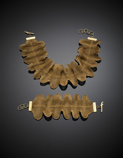 Yellow gold jewellery set comprising a cloth worked ruffled choker and bracelet accented with a small bead border, choker cm 35.50 and bracelet cm 18 circa, in all gross g 58.35 circa. Signed and marked Fraccari, 1496 VI. Cased by Mirella Denti