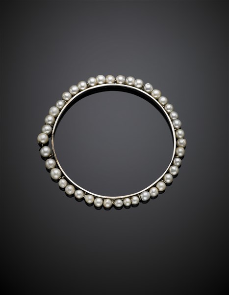White gold bangle accented with cultured pearls from mm 3.90 to mm 5.50 circa, g 14.70 circa, diam. cm 5.90 circa. Marked 501 AL. (defects)