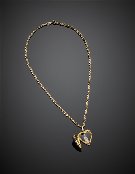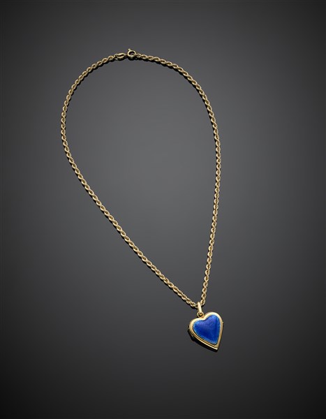 Catena in oro giallo con pendente a cuore di cm 3,10 circa rifinito in smalto blu con allinterno la raffigurazione della Madonna, lordi g 22,20 circa, lungh. cm 42,10 circa. Catena marcata 103 AR, il pendente firmato Otitre. Con custodia