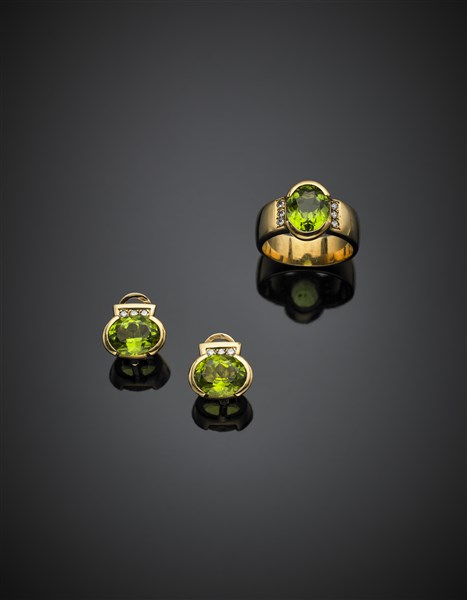 Demi parure in oro giallo diamanti e peridoti composta da un anello e orecchini a lobo con clip, complessivi g 16,20 circa misura 11/51. Marcato 60 MI.