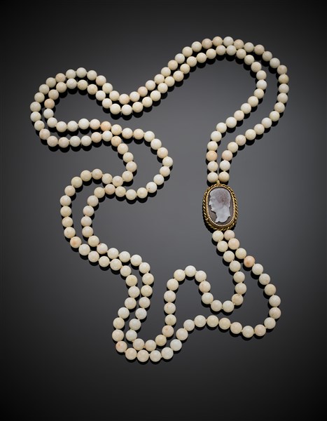 Two strand pink whitish coral bead necklace with yellow gold agate cameo clasp/central, g 173.75 circa, length cm 88.50 circa.