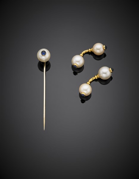Gemelli e spillone in oro giallo, perle coltivate di mm 8,50 circa e zaffiri ca