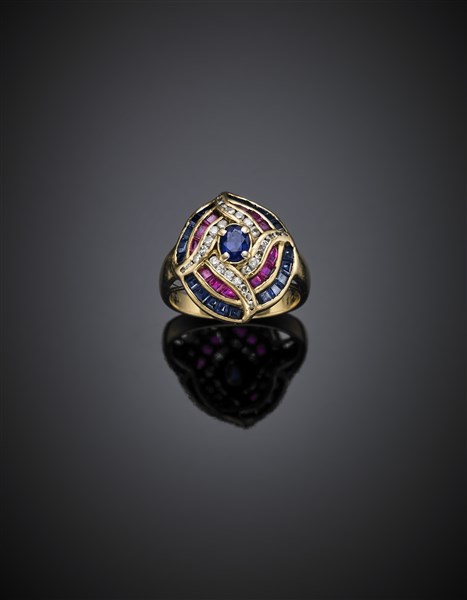 Anello in oro giallo con rubini, zaffiri e diamanti, g 7 circa misura 14/54.