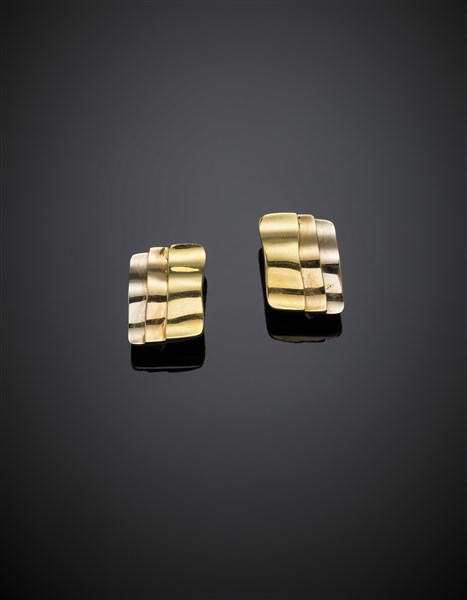 Orecchini in oro a onda a tre colori, g 17,20 circa, lungh. cm 2,20 circa. Marc