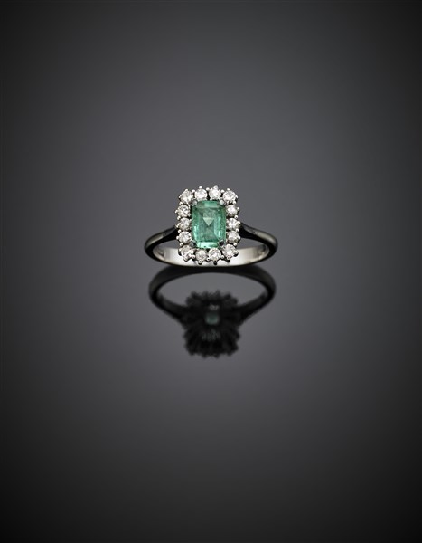 Anello in oro bianco con smeraldo ottagonale e diamanti, g 3,60 circa misura 13/53.