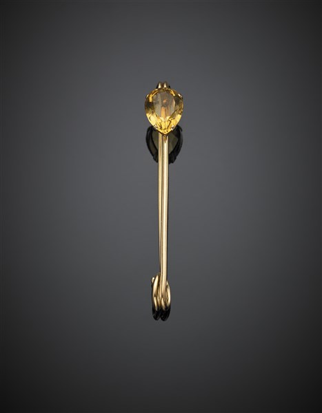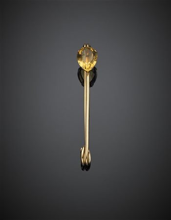 Pear shape citrine quartz yellow gold safety pin, g 7.70 circa, length cm 6.80 circa.