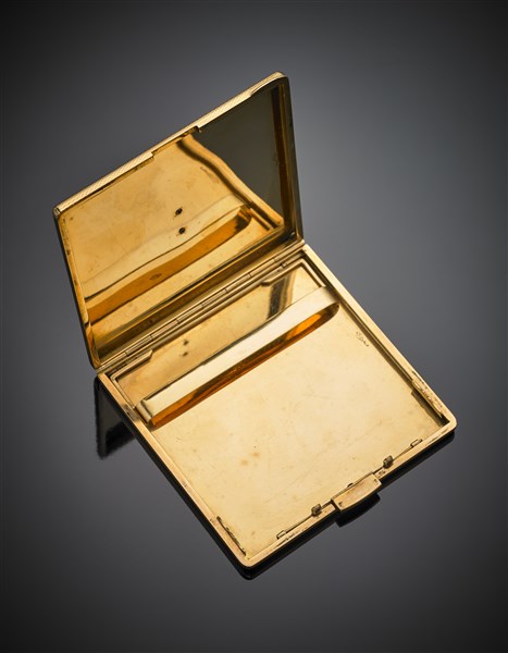 Portasigarette in oro giallo zigrinato con stemma araldico, g 110,10 circa, lungh. cm 8,10 circa. Marcato 39 MI. In custodia Chiaravalli