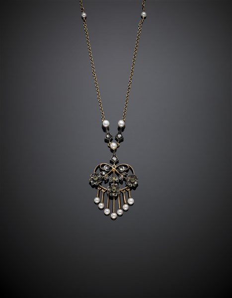 Seed-pearl yellow gold necklace with silver and gold rose cut diamond and pearl central, g 10.20 circa, length cm 44.50 circa.