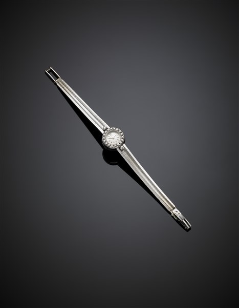 Orologio da polso da donna in oro bianco e diamanti con bracciale integrato, g 23,50 circa, lungh. cm 15,10 circa. Quadrante, corona e bracciale marcati Omega.