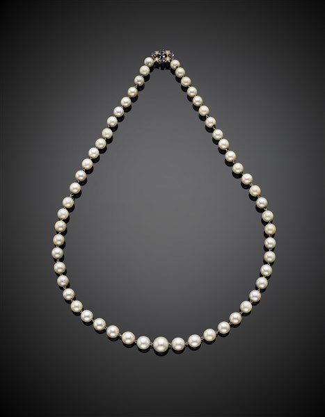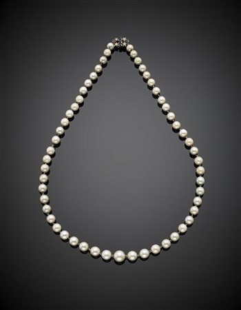 Cultured pearl graduated necklace with diamond and sapphire white gold clasp, also strung in white gold, pearl from mm 6.70 to mm 9.30 circa, g 35.90 circa, length cm 53 circa.
