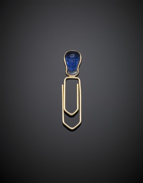 Segnalibro in oro giallo e pasta vitrea blu scolpita, g 3,30 circa, lungh. cm 5 circa.