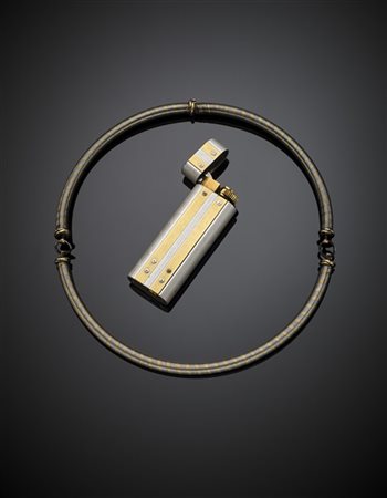 Yellow gold and steel lot comprising a lighter signed Cartier Paris, 94184 M with accessory and guarantee, and an articulated cm 42 circa necklace, in all g 136.10 circa.