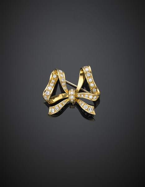 Spilla/pendente a fiocco in oro giallo e diamanti, g 6,40 circa, largh. cm 2,80