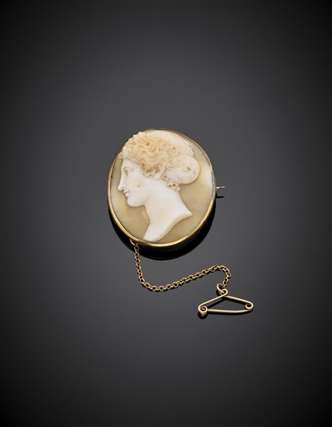 Spilla in oro giallo 333/1000 e cammeo in conchiglia, g 9,46 circa, lungh. cm 3,80 circa.