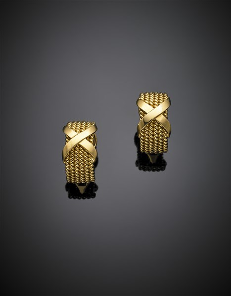 Yellow gold rope and ribbon earclips, g 17.20 circa, length cm 2 circa. Signed and marked Tiffany & Co, Schlumberger, 750.