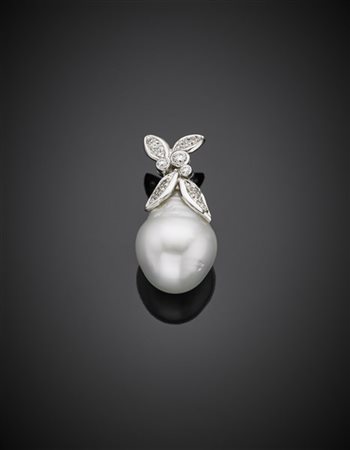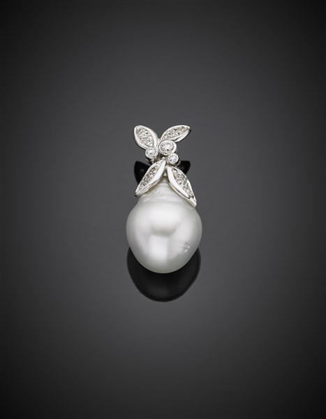 Pendente in oro bianco e diamanti con perla South Sea irregolare di mm 20,38x16,40 circa, g 10,65 circa, lungh. cm 3,50 circa.