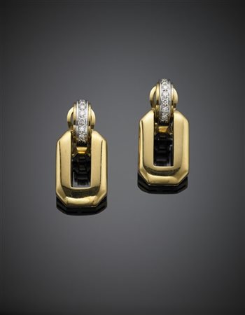 Bi-coloured gold diamond pendant earclips, g 24.20 circa, length cm 3.80 circa. Marked 927 MI. (losses)