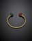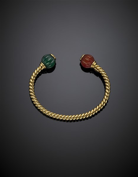 Bracciale rigido in oro giallo ritorto terminato da due boules scolpite in corniola e quarzo microcristallino verde, g 37,20 circa, diam. cm 6 circa. Firmato Violetti. (difetti)