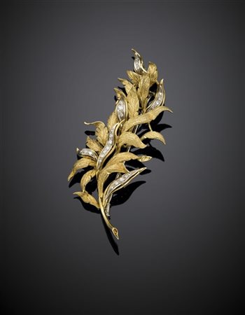 Spilla in oro giallo satinato rifinita in diamanti , g 25,20 circa, lungh. cm 9,20 circa. Marcata 160 AL.