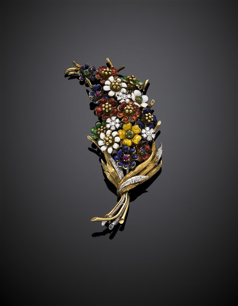Spilla a mazzo di fiori in oro giallo e bianco con diamanti, gemme e smalti, g