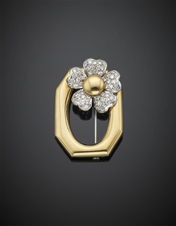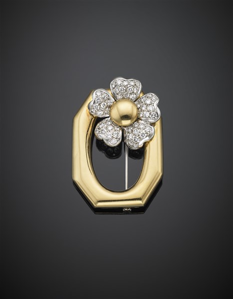 Broche in oro giallo e diamanti con fiore, per complessivi ct. 1,70 circa, g 23