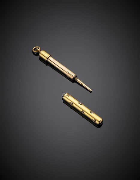 Yellow gold pendant lead holder accented with seed pearls, gross g 12.43 circa, length cm 5.50 circa. French hallmark. (defects)