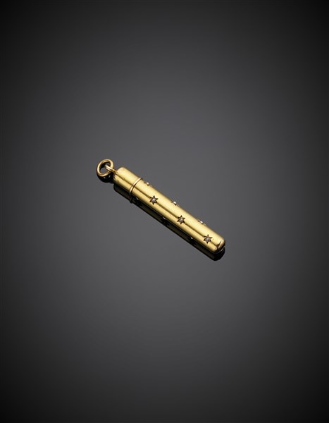 Portamina pendente in oro giallo con microperle, lordi g 12,43 circa, lungh. cm 5,50 circa. Marchio francese. (difetti)