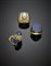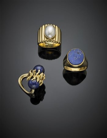 Lotto di tre anelli in oro giallo, perla mabè, lapis e pietre dure blu, misura