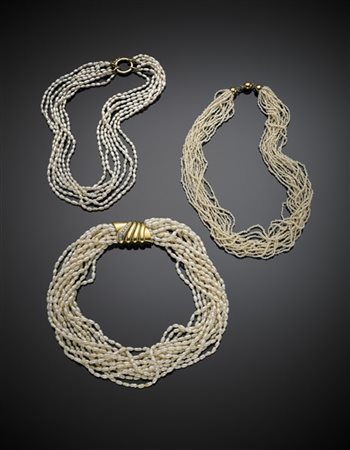 Lotto di tre collane multifili di perle d'acqua dolce con chiusura in oro giall
