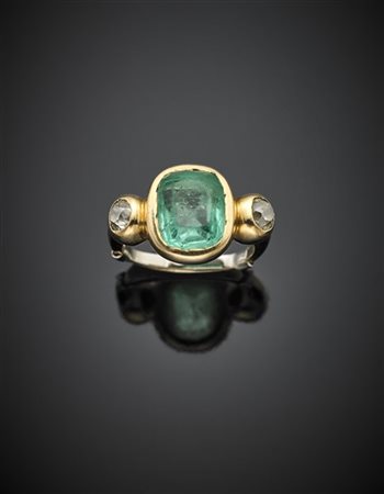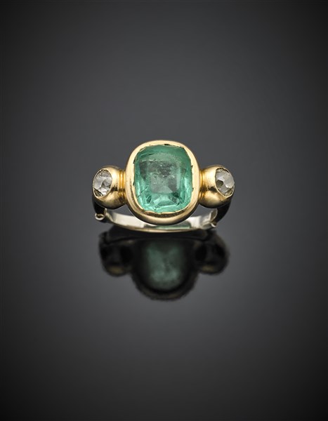 Anello oro giallo con smeraldo a cuscino di ct. 3,60 circa e due diamanti old mine per complessivi ct. 0,60 circa, g 6,70 circa misura 12/52. In scatola originale Confalonieri (lievi difetti)