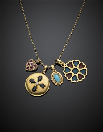 Yellow gold lot comprising cm 40 circa chain with four variously shaped pendants accented with diamonds, rubies, sapphires and turquoise, one with plique a jour enamel, in all g 37.70 circa. (defects)