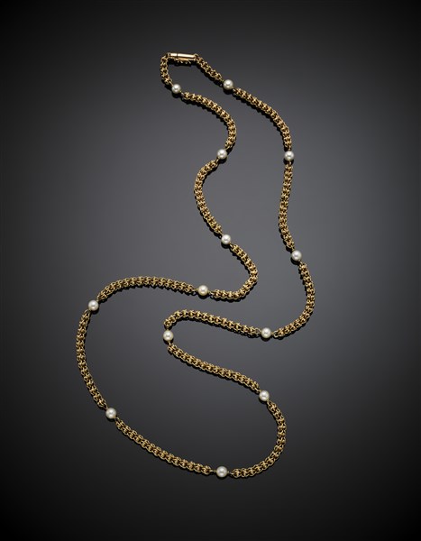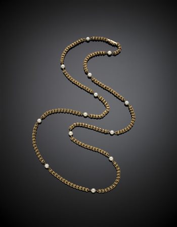 Collana lunga a maglia intrecciata in oro giallo e perle, g 46,60 circa, lungh.