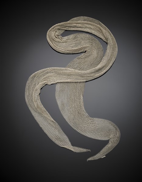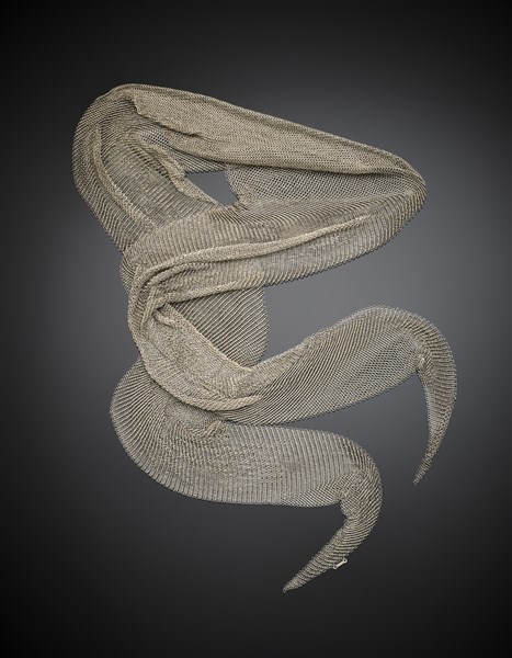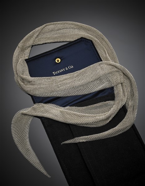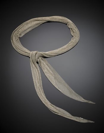Collier a sciarpa in rete d'argento 925/1000, g 136,50 circa, lungh. cm 104,50 circa. Firmato e marcato T.&Co. Peretti, 925. In custodia originale