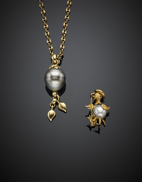 Yellow gold and grey pearl lot comprising a cm 3 circa duck brooch and a cm 35.50 circa anchor chain necklace with pendant pearl of mm 16.50x 19.20 circa, in all g 32 circa. Chain marked 229 AR.