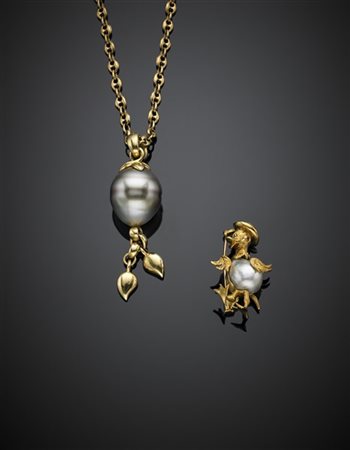 Lotto in oro giallo e perle grigie composto da una spilla a forma di papero di cm 3 circa e un collier a catena marinara di cm 35,50 circa con perla pendente di mm 16,15x19,20 circa, complessivi g 32 circa. Catena marcata 229 AR.