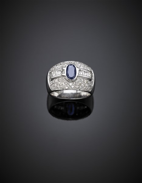 Anello in oro bianco con diamanti rotondi e carré, zaffiro ovale, diamanti per complessivi ct. 0,50 circa, g 11 circa misura 15/55. Marchio francese.
